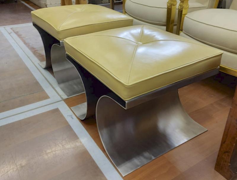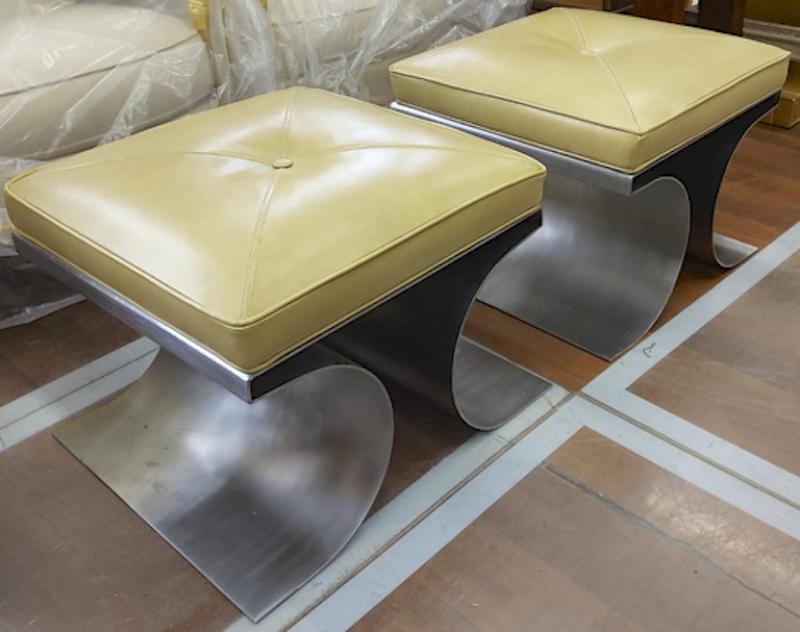 Michel Boyer iconic pair of bruised steel and leather stool.